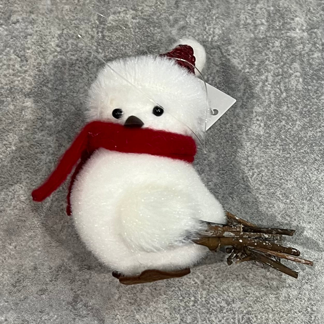 White bird in red Christmas hat.