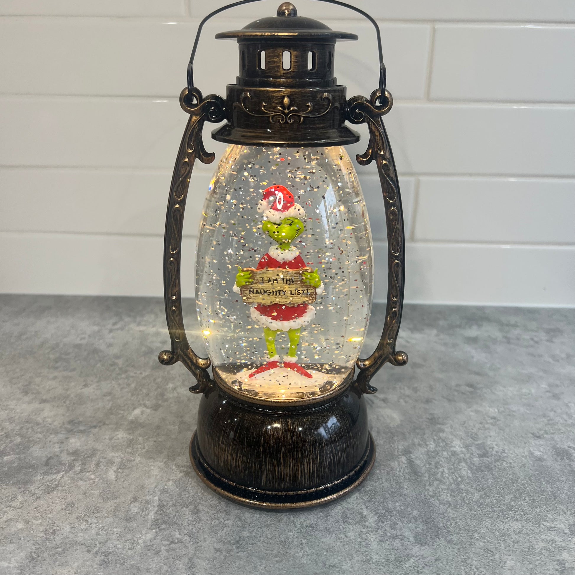 Grinch glitter lantern holding a sign “I am the naughty list”